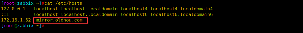 [root@mirror ]# echo "172.16.1.62 mirror.oldhou.com" >>/etc/hosts