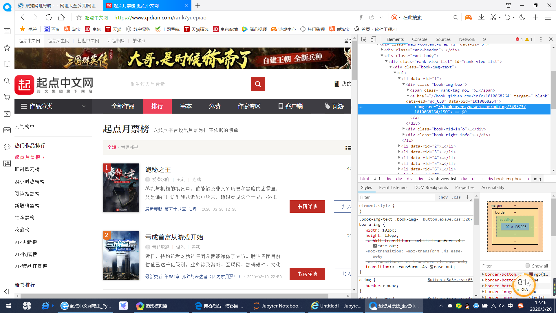 #获取各书的id import re import requests def book_list(): url = 'https://www.qidian.com/rank' # 打开相应url并把页面作为返回 html = requests.get(url).text print(html) ren = r' </a><img src="//bookcover.yuewen.com/qdbimg/349573/1010868264/90">' ren_url = re.compile(ren) book_url = ren_url.findall(html) return book_url()