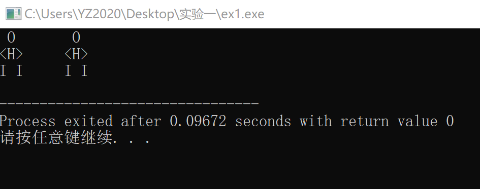 //打印一个字符小人 #include<stdio.h> int main(){ printf(" O O\n"); printf("<H> <H>\n"); printf("I I I I\n"); return 0; }