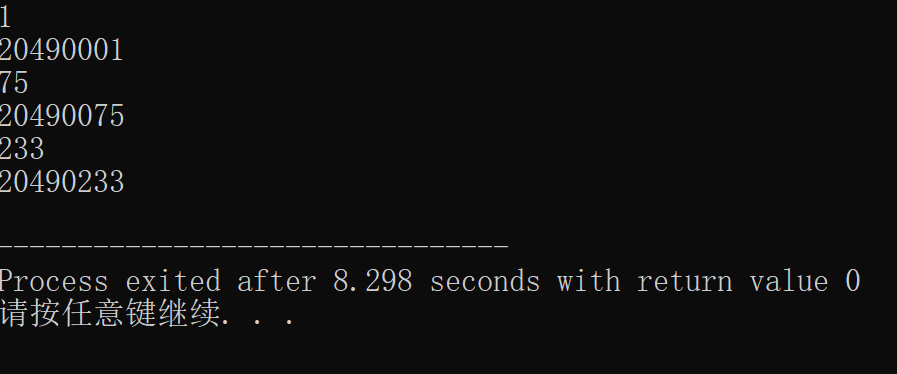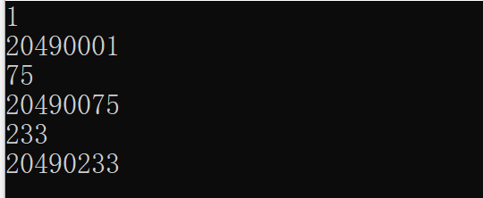 // 格式化输入、输出函数的简单应用 #include <stdio.h> int main() { int num,t=1; while(t<=3) { scanf("%d", &num); printf("2049%04d\n", num); t++; } return 0; }