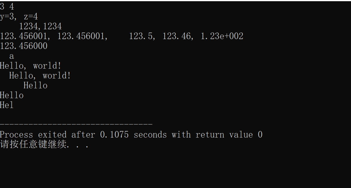 // 格式化输入输出函数,及各种格式控制符的使用 #include <stdio.h> int main() { int x=1234; float f=123.456; double m=123.456; char ch='a'; char a[]="Hello, world!"; // 定义一个数组a,数组中存放字符串常量hello,world! int y=3, z=4; printf("%d %d\n", y, z); printf("y=%d, z=%d\n", y,z); printf("%8d,%2d\n", x,x); printf("%f, %8f, %8.1f, %0.2f, %.2e\n",f,f,f,f,f); printf("%lf\n",m); printf("%3c\n", ch); printf("%s\n%15s\n%10.5s\n%2.5s\n%.3s\n",a,a,a,a,a); return 0; }