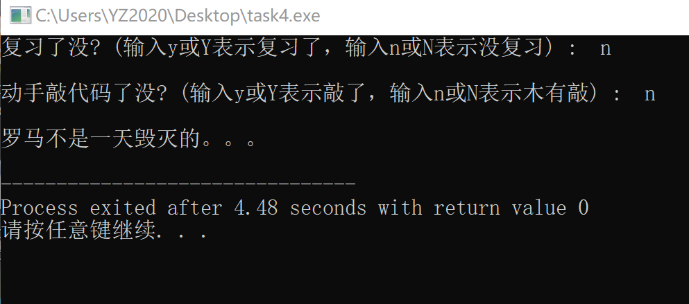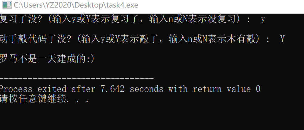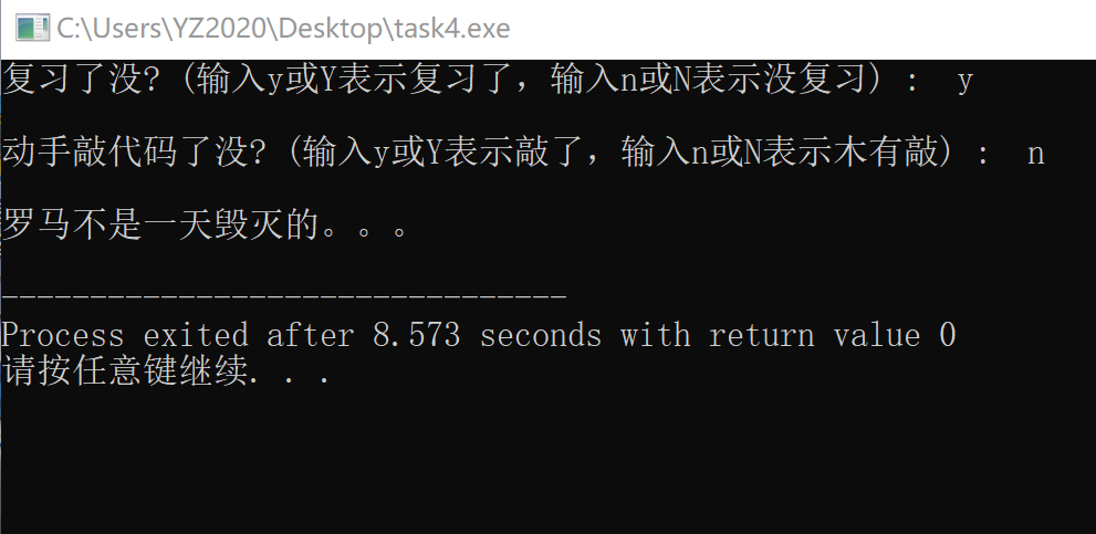 #include <stdio.h> int main() { char ans1, ans2; printf("复习了没? (输入y或Y表示复习了,输入n或N表示没复习) : "); ans1 = getchar(); // 从键盘输入一个字符,赋值给ans1 getchar(); // 思考这里为什么要加这一行。试着去掉这一行,看看对运行有没有影响。 printf("\n动手敲代码了没? (输入y或Y表示敲了,输入n或N表示木有敲) : "); ans2 = getchar(); if(ans1=='y'&ans2=='y' or ans1 == 'y' &ans2 == 'Y' or ans1=='Y' & ans2=='y' or ans1=='Y'&ans2=='Y') // 待补足,判断用户回答ans1和ans2都是小写y或大写Y printf("\n罗马不是一天建成的:)\n"); else printf("\n罗马不是一天毁灭的。。。\n"); return 0; }