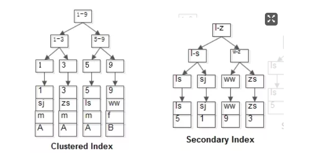 聚集索引叶子节点存储:行记录.(下图左) -