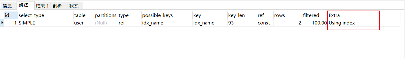 若建立联合索引时,即name,sex都加上索引,此时再去查询,会发现Extra又出现Using index,此时就是覆盖索引生效,通过覆盖索引一次就能拿到需要的数据,不用在回表,此时可以提高我们的查询效率.