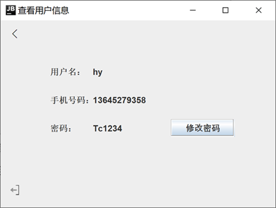 - 具体操作为:管理员账号登陆后,输入想要查看的用户个人信息(用户名不可相同,若相同注册时会弹出提示),然后可以看到该用户绑定的手机号码、密码,可以点击修改密码后修改该用户的密码(管理员可设置任意密码,因为是管理员)。