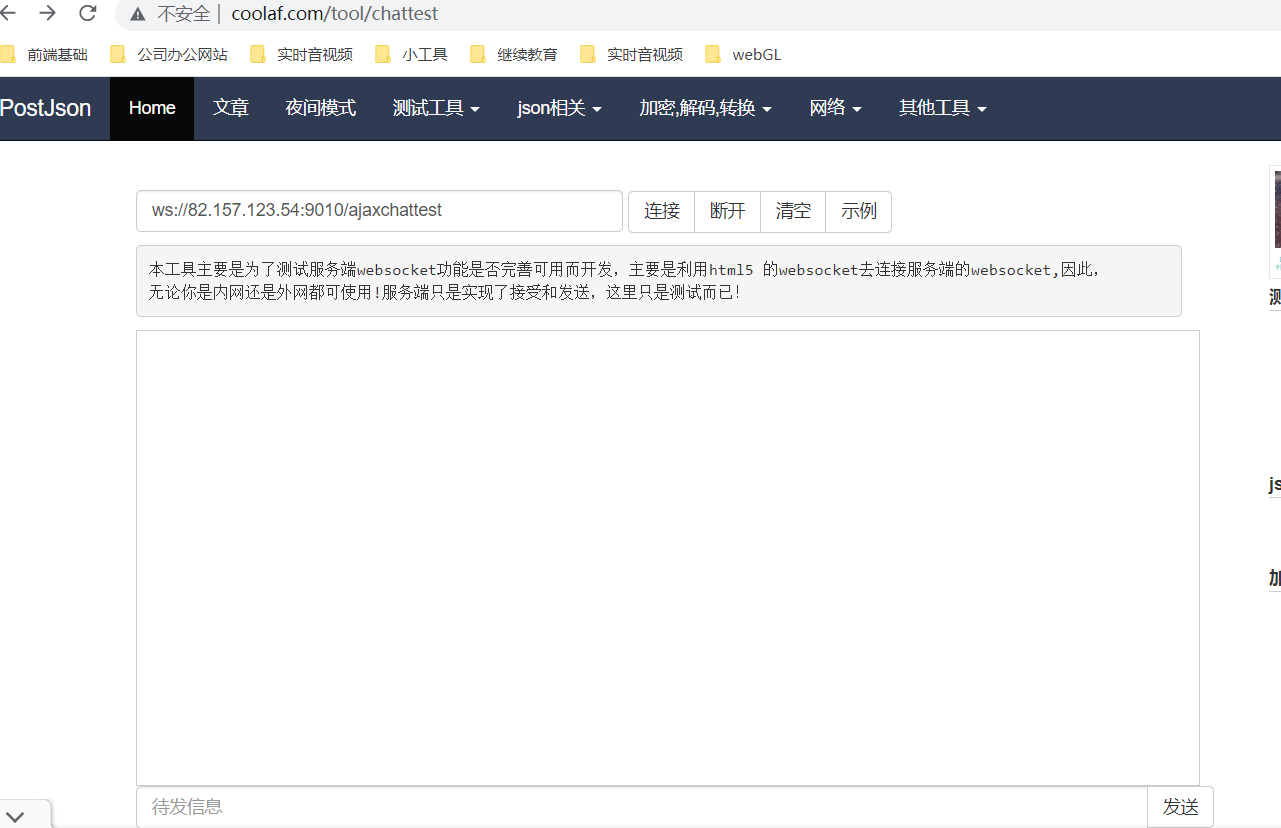 3、一款websocket在线调试工具,测试工具中也可进行post和get请求测试 http://coolaf.com/tool/chattest