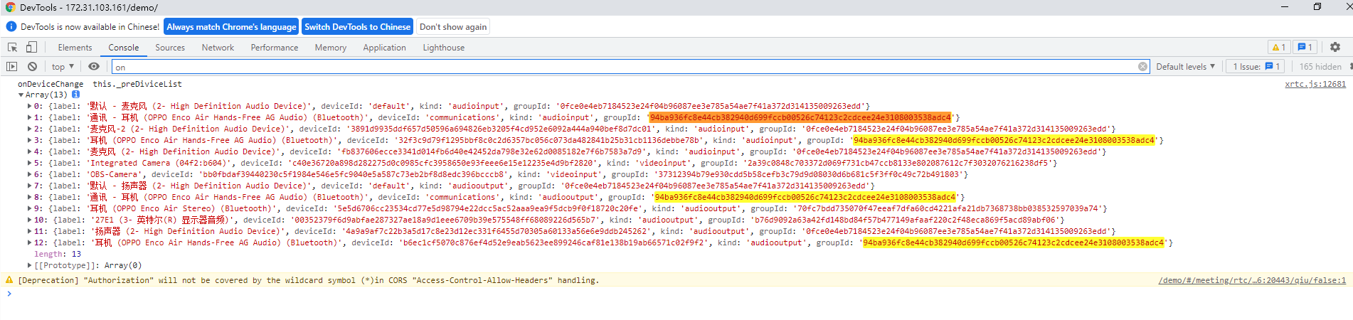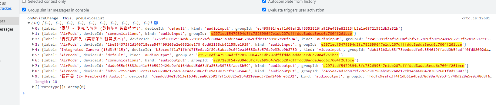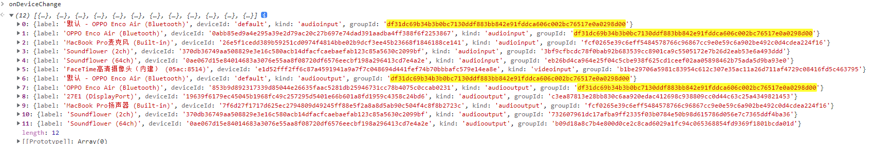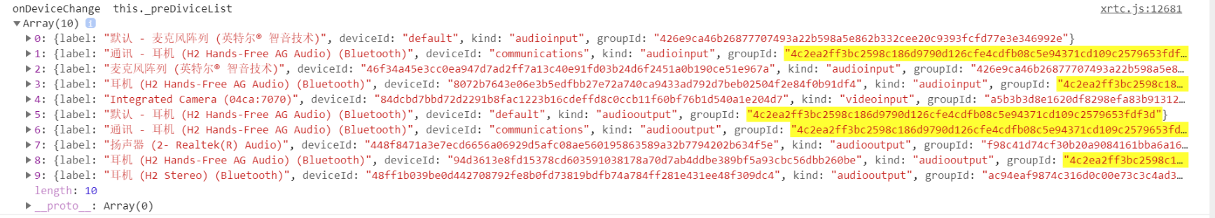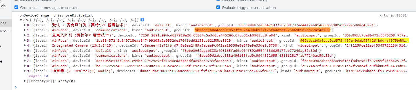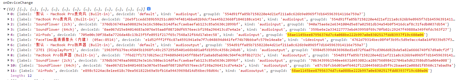 a、普通蓝牙耳机可通过label和groupId进行判断,测试发现普通蓝牙耳机label会区分Hands-free和Stereo模式,麦克风的groupId和Hands-free模式的扬声器groupId一致,苹果耳机无法根据label判断,且groupId每次的表现并不一致。