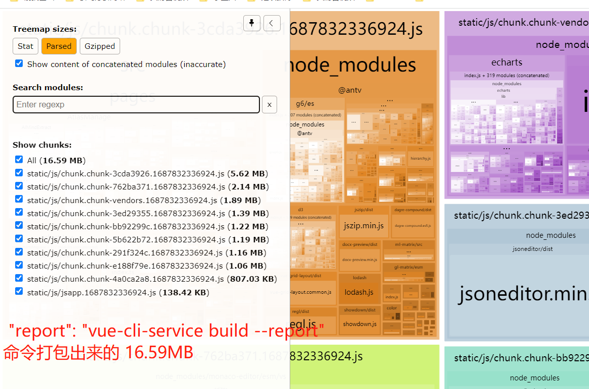 最近接触一个比较大的vue项目,发现打包后的项目文件体积很大,最大的的一个js有17M,于是用 Vue CLI report 分析一下