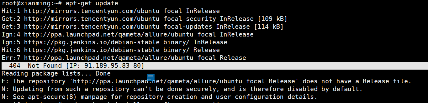 Ubuntu执行apt-get update报没有Release的解决办法:http://ppa.launchpad.net/qameta/allure/ubuntu focal Release