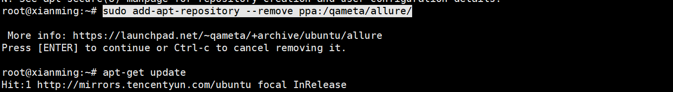 root@xianming:~# sudo add-apt-repository --remove ppa:/qameta/allure/