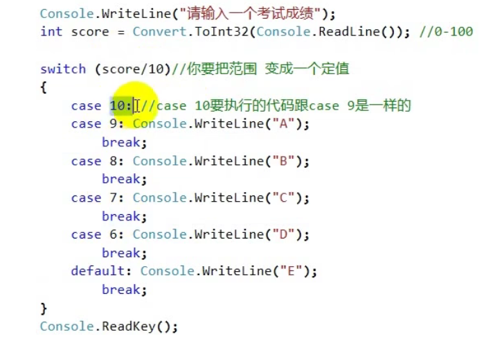 switch case 中,当两种情况需要执行一模一样的操作时,可以省略一种情况的代码,如图,省略了case 10 这一情况的部分代码。