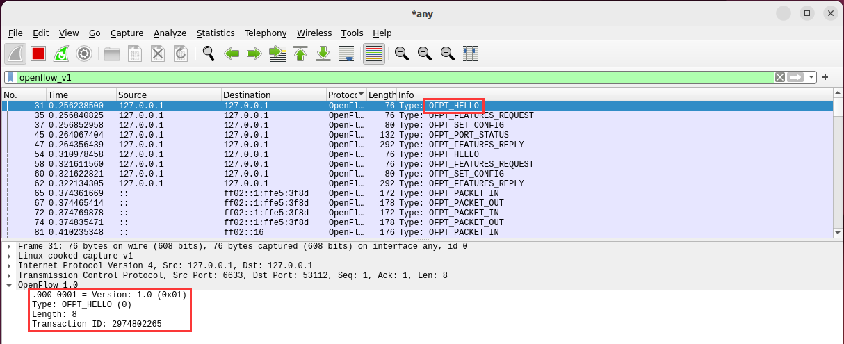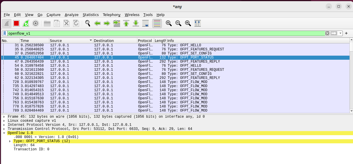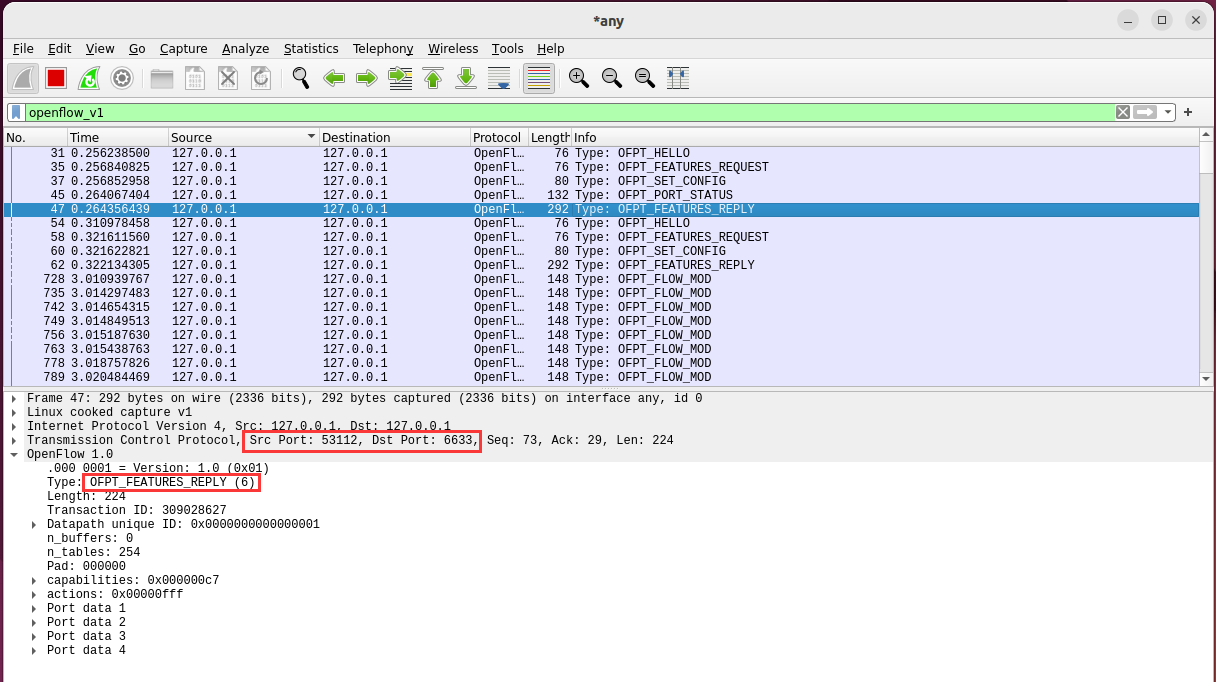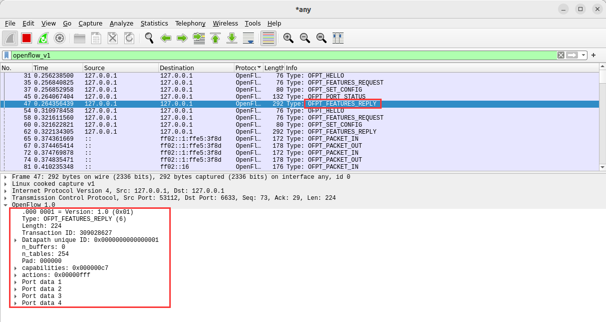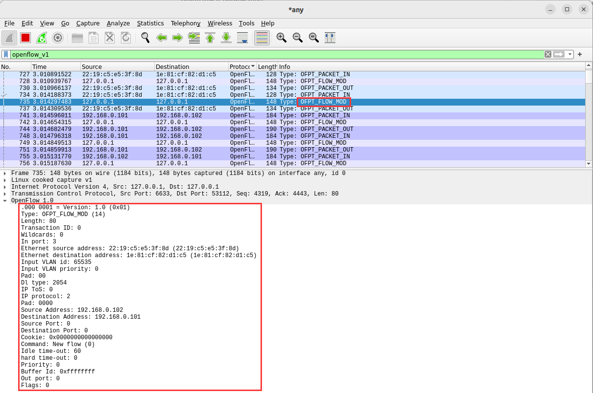 - 能够运用 wireshark 对 OpenFlow 协议数据交互过程进行抓包;
