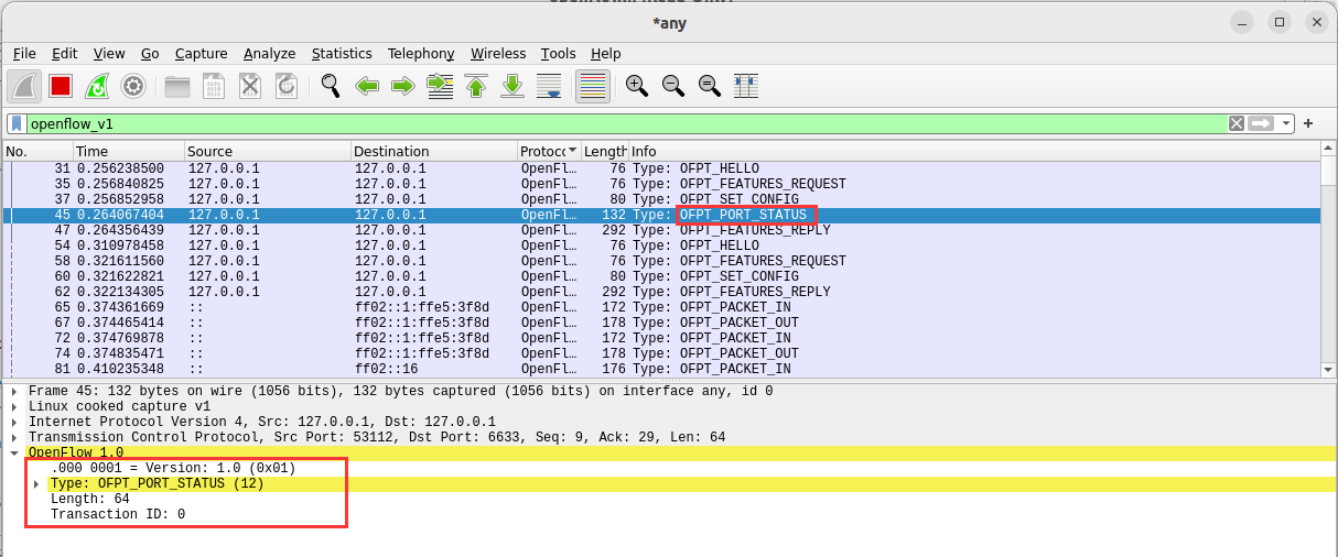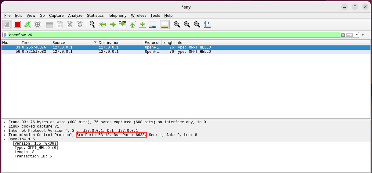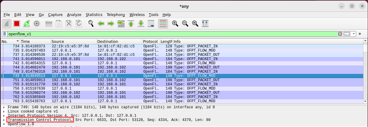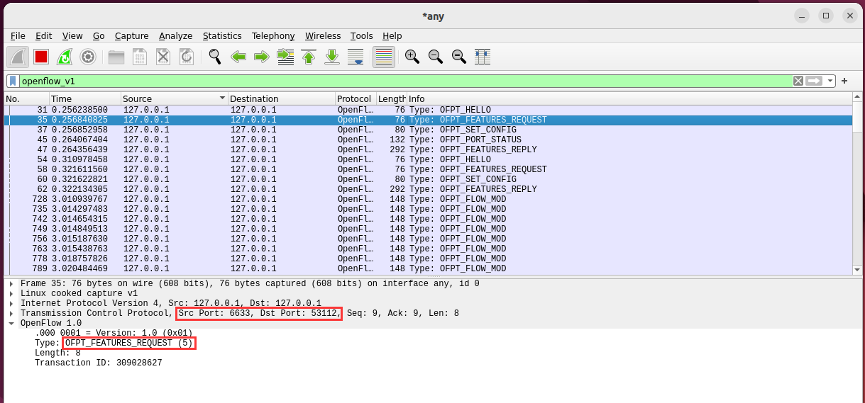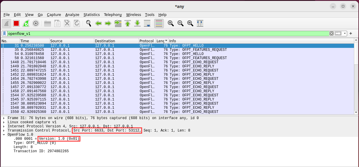 - 能够运用 wireshark 对 OpenFlow 协议数据交互过程进行抓包;
