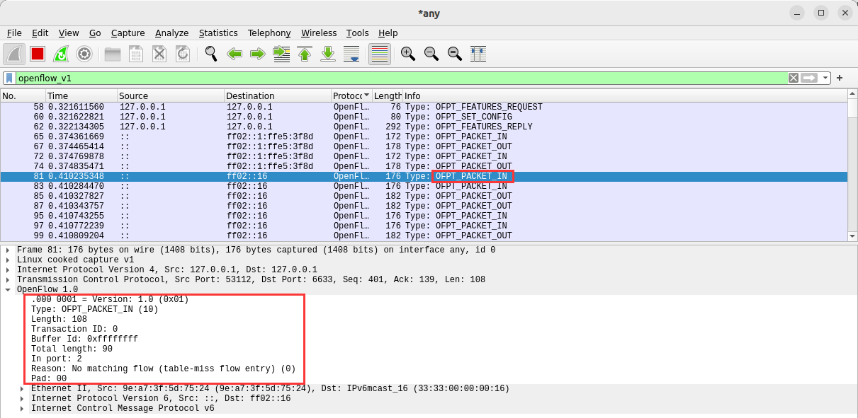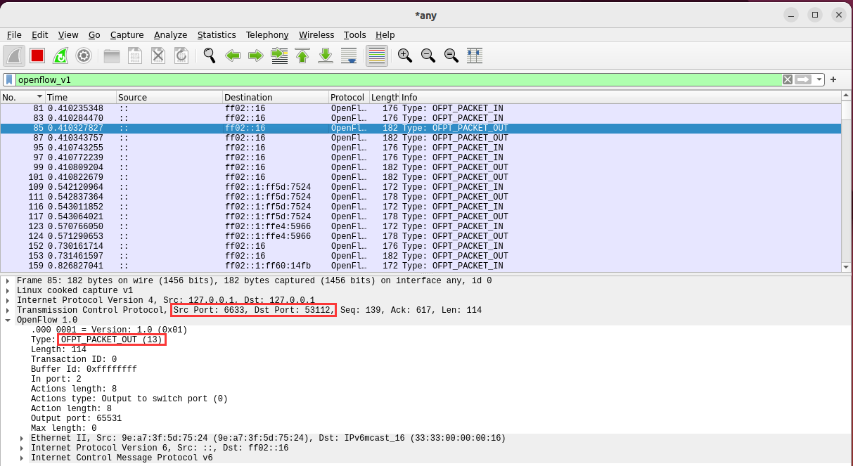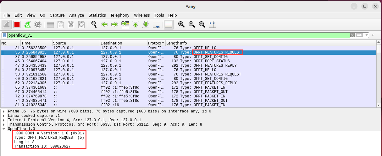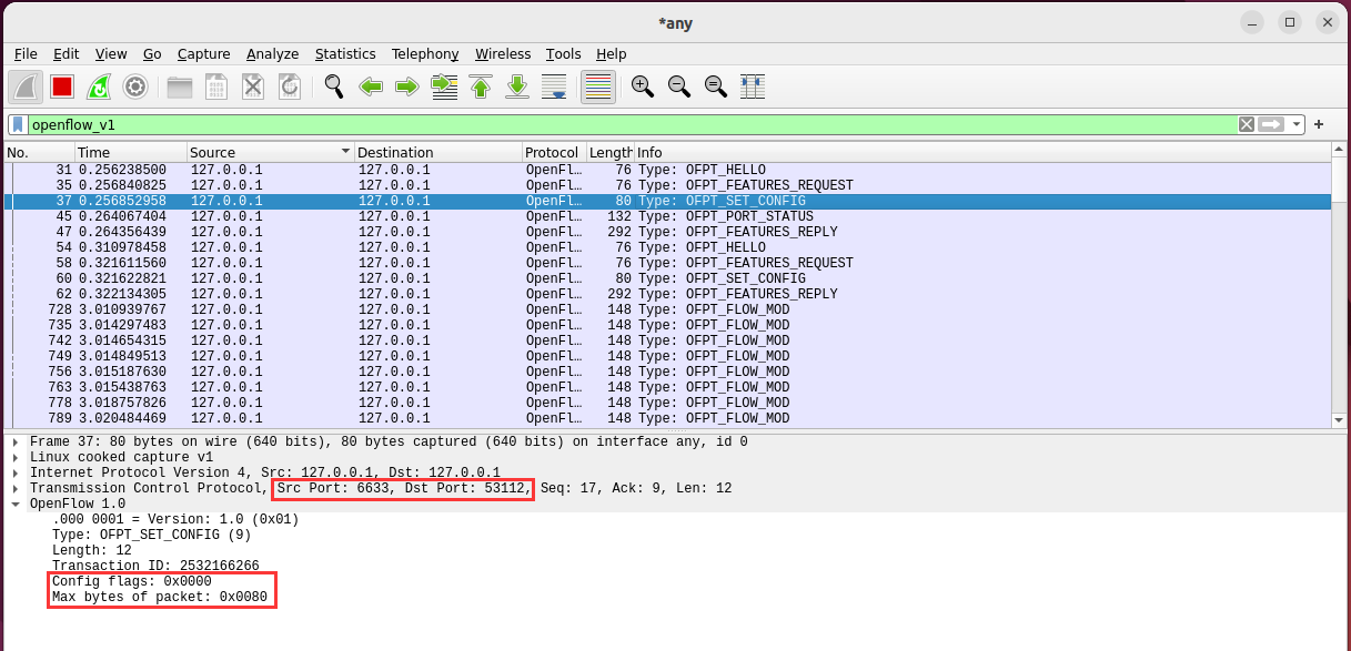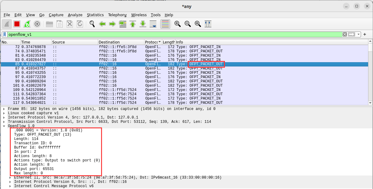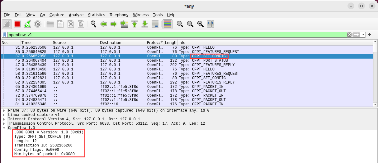 - 能够借助包解析工具,分析与解释 OpenFlow协议的数据包交互过程与机制。