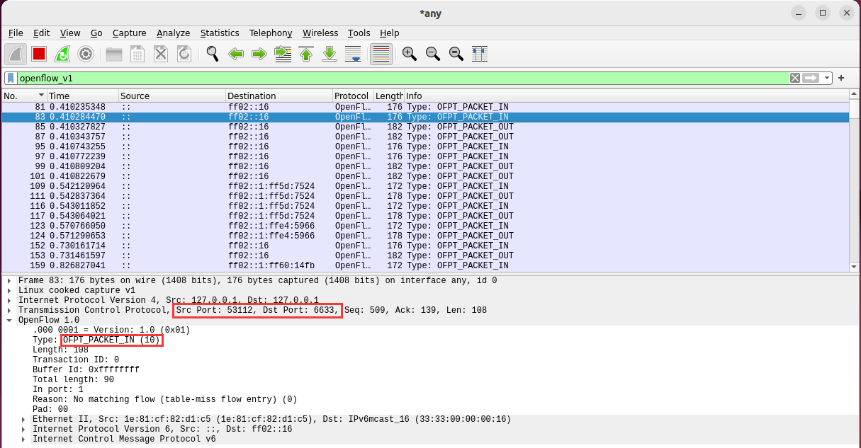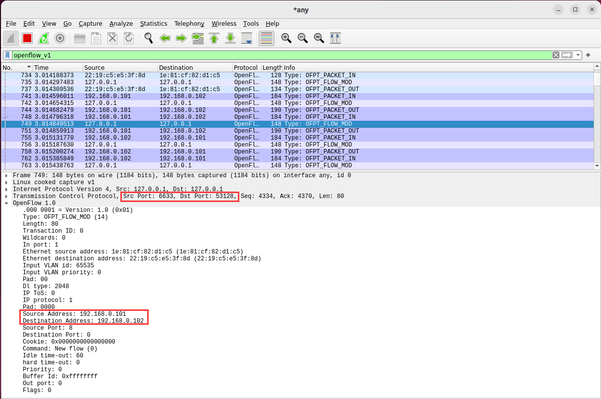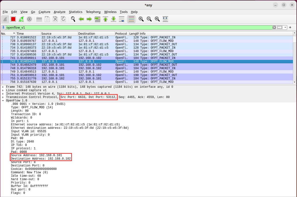 分析抓取的flow_mod数据包,控制器通过6633端口向交换机53112端口、交换机53128端口下发流表项,指导数据的转发处理