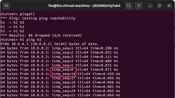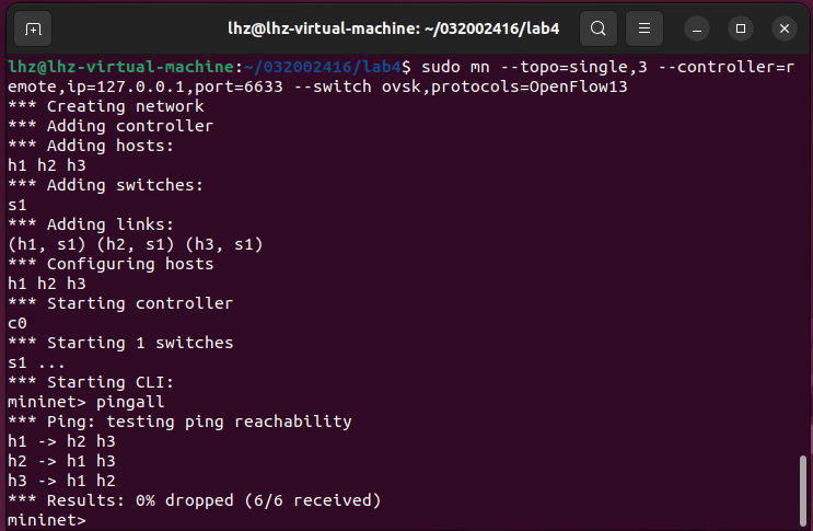 sudo mn --topo=single,3 --controller=remote,ip=127.0.0.1,port=6633 --switch ovsk,protocols=OpenFlow13- 在mininet命令行中输入