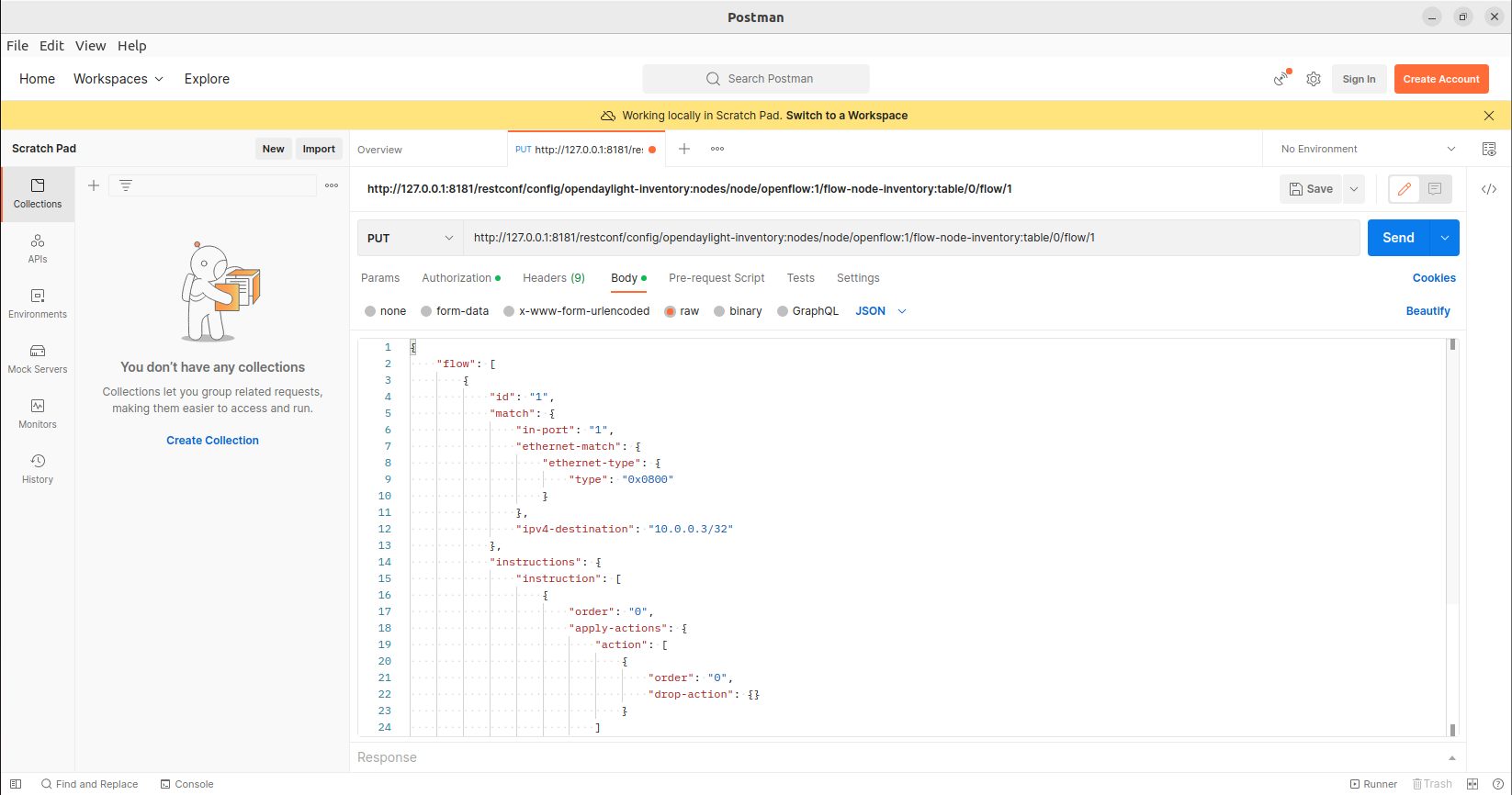 - 能够使用Postman工具调用OpenDaylight API接口下发流表。