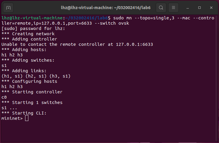 建立拓扑sudo mn --topo=single,3 --mac --controller=remote,ip=127.0.0.1,port=6633 --switch ovsk