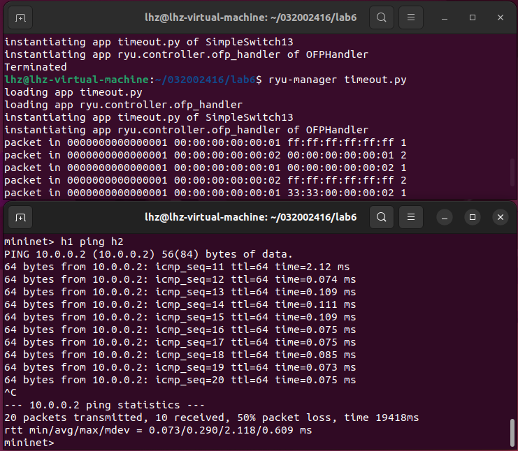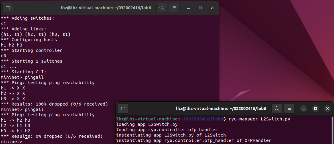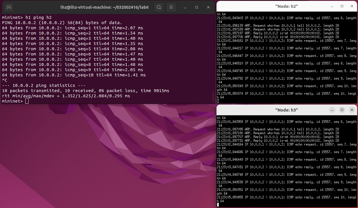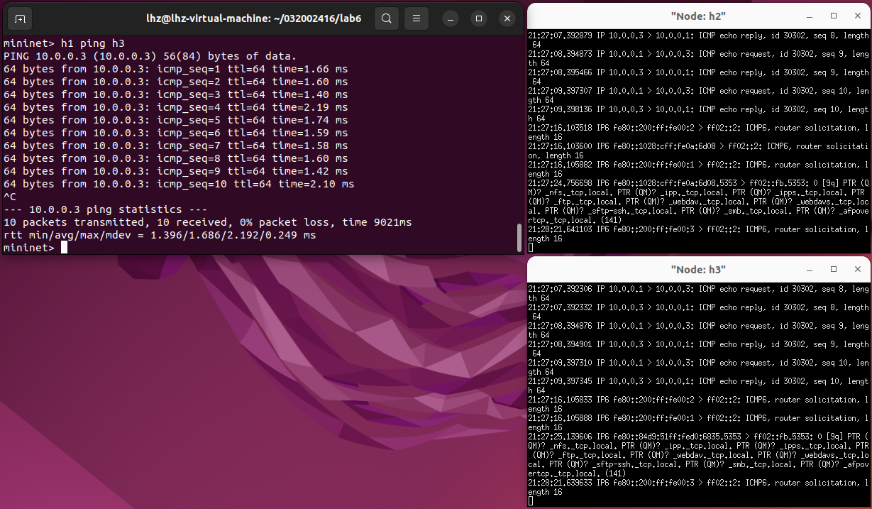 - 阅读Ryu文档的The First Application一节,运行当中的L2Switch,h1 ping h2或h3,在目标主机使用 tcpdump 验证L2Switch,分析L2Switch和POX的Hub模块有何不同。
