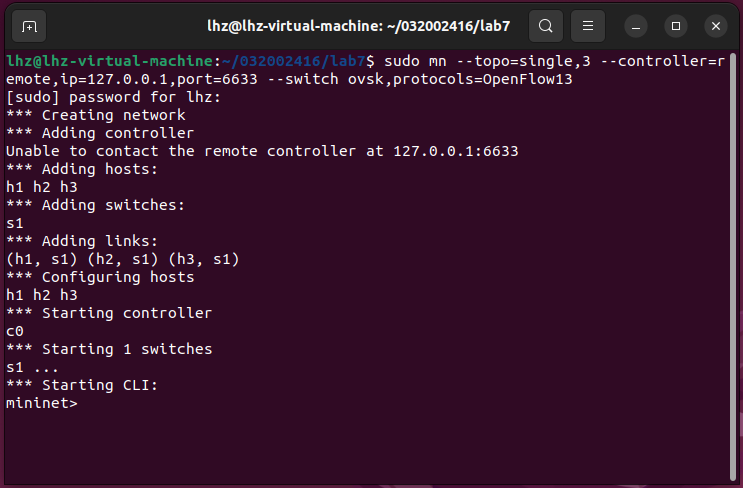 搭建拓扑 命令行输入sudo mn --topo=single,3 --controller=remote,ip=127.0.0.1,port=6633 --switch ovsk,protocols=OpenFlow13