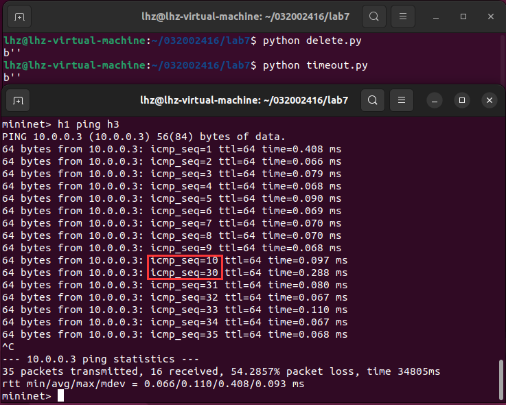 (3) 下发硬超时流表,实现拓扑内主机h1和h3网络中断20s。