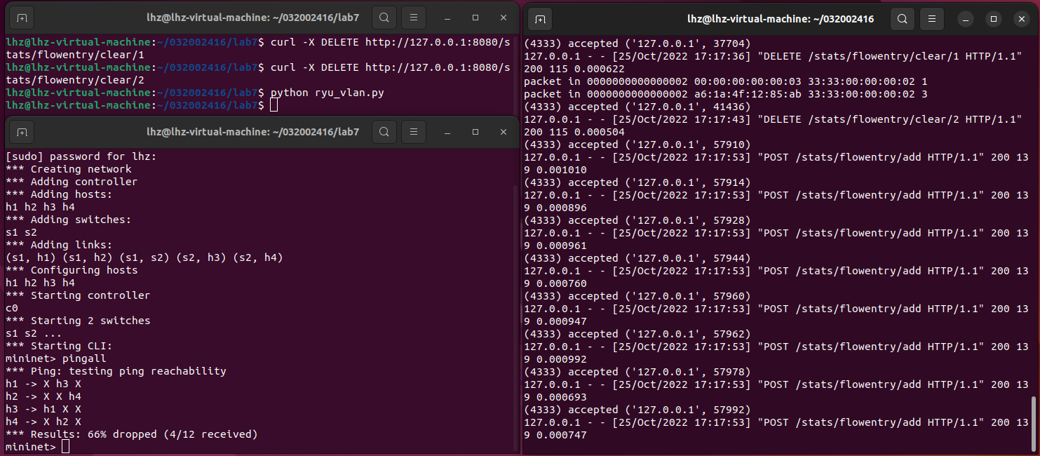 (2) 参考Ryu REST API的文档,基于VLAN实验的网络拓扑,编程实现相同的VLAN配置。