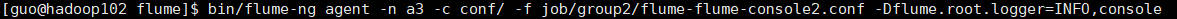 bin/flume-ng agent -n a3 -c conf/ -f job/group2/flume-flume-console2.conf -Dflume.root.logger=INFO,console