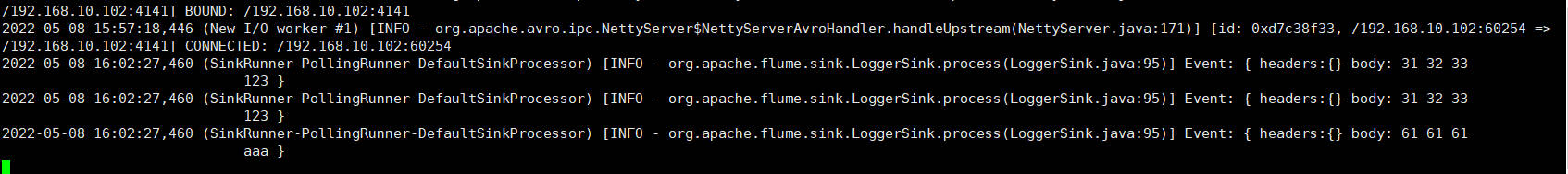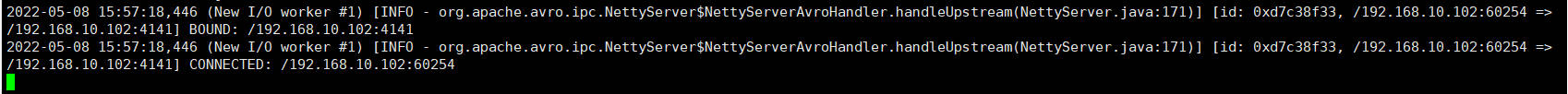 # Name the components on this agent a2.sources = r1 a2.sinks = k1 a2.channels = c1 # Describe/configure the source a2.sources.r1.type = avro a2.sources.r1.bind = hadoop102 a2.sources.r1.port = 4141 # Describe the sink a2.sinks.k1.type = logger # Describe the channel a2.channels.c1.type = memory a2.channels.c1.capacity = 1000 a2.channels.c1.transactionCapacity = 100 # Bind the source and sink to the channel a2.sources.r1.channels = c1 a2.sinks.k1.channel = c1