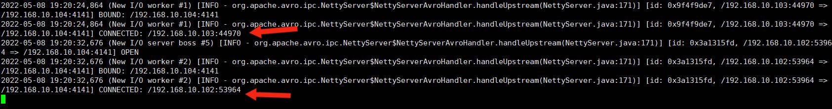 # Name the components on this agent a3.sources = r1 a3.sinks = k1 a3.channels = c1 # Describe/configure the source a3.sources.r1.type = avro a3.sources.r1.bind = hadoop104 a3.sources.r1.port = 4141 # Describe the sink a3.sinks.k1.type = logger # Describe the channel a3.channels.c1.type = memory a3.channels.c1.capacity = 1000 a3.channels.c1.transactionCapacity = 100 # Bind the source and sink to the channel a3.sources.r1.channels = c1 a3.sinks.k1.channel = c1
