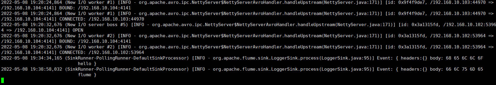分别开启对应配置文件:flume3-flume-logger.conf,flume2-netcat-flume.conf,flume1-logger-flume.conf。在hadoop104上