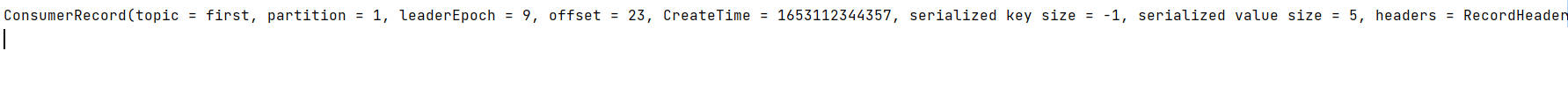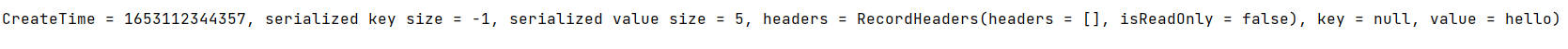sumerRecord(topic = first, partition = 1, leaderEpoch = 9, offset = 23, CreateTime = 1653112344357, serialized key size = -1, serialized value size = 5, headers = RecordHeaders(headers = [], isReadOnly = false), key = null, value = hello)