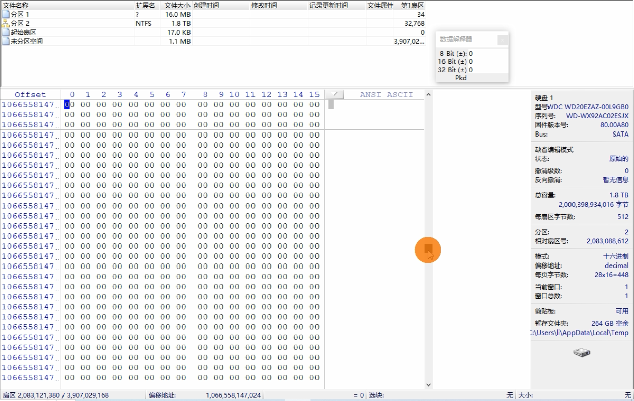 西部数据WD20EZAZ台式机2T蓝盘,客户是误操作格式化了硬盘,导致数据全部丢失,使用普通数据恢复软件扫描无效,因为底层扇区全是00状态,就像新盘一样。客户找了多座城市的多家数据恢复公司或机构,都被告知无法恢复。后来看见我们有很多类似的成功案例,就让外地的数据恢复同行直接寄到我们杭州数据恢复中心,想让我们再研究试一下。