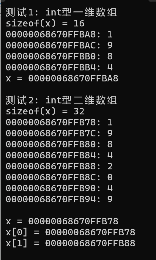 // 输出二维数组名x, 以及,x[0], x[1]的值