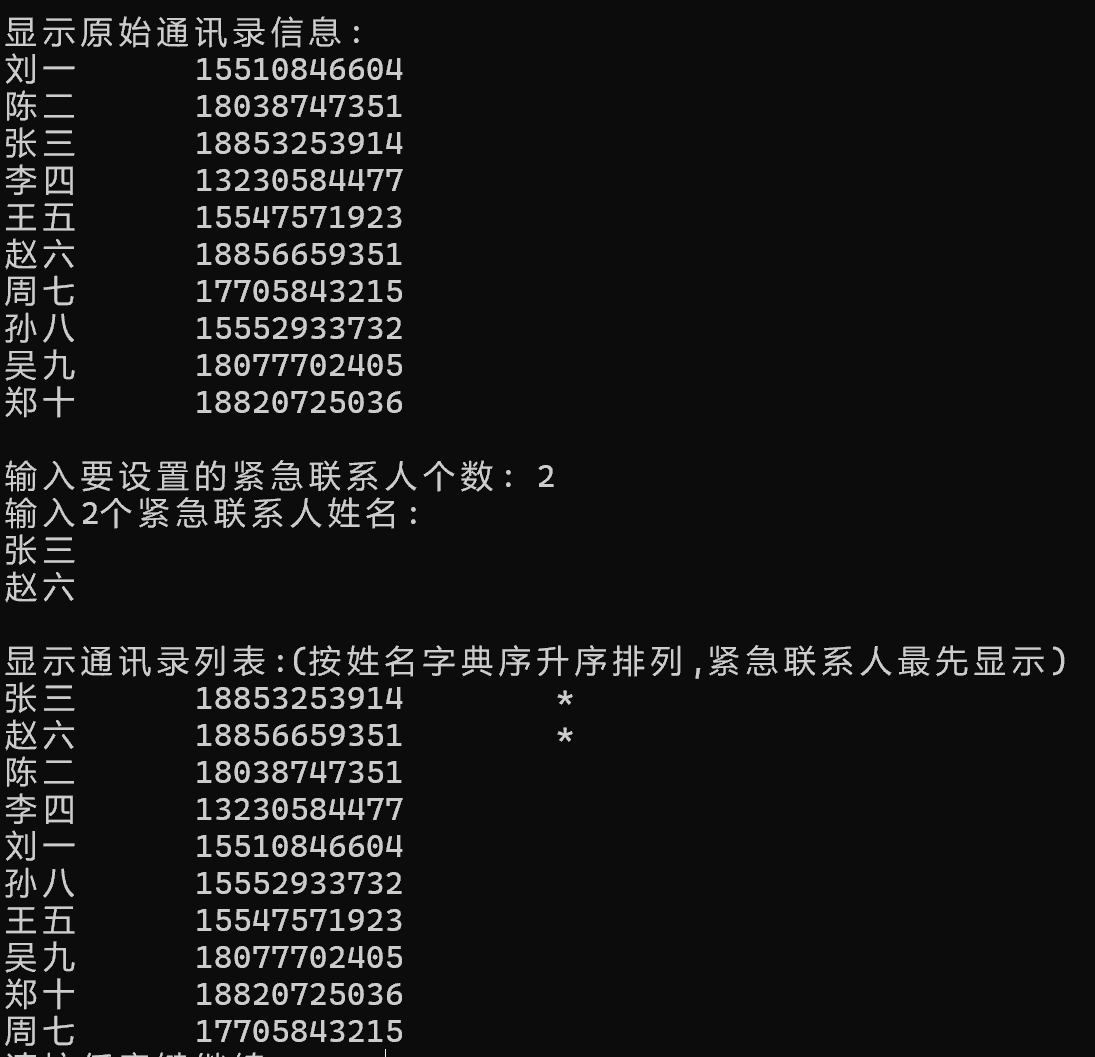 void display(Contact x[], int n); // 按联系人姓名字典序升序显示信息,紧急联系人最先显示