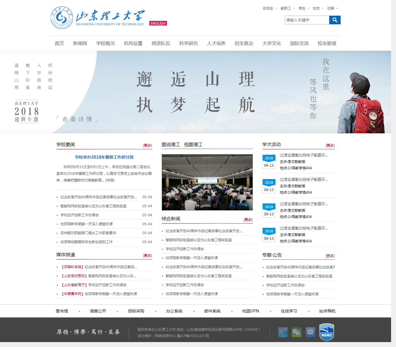 <!--head start--> <header class="g-head"> <div class="head"> <a href=""><img src="img/logo.png" class="logo"/></a> <a href="" class="en">english</a> <div class="con"> <p> <a href="">在校生<span>+</span></a> <a href="">教职工<span>+</span></a> <a href="">考生<span>+</span></a> <a href="">校友<span>+</span></a> <a href="">访客<span>+</span></a> </p> <div class="input"> <input type="text" placeholder="请输入关键字"/> <input type="button"/> </div> </div> </div> <ul class="m-nav"> <li><a href="">首页</a></li> <li><a href="">新闻网</a></li> <li><a href="">学校概况</a></li> <li><a href="">机构设置</a></li> <li><a href="">师资队伍</a></li> <li><a href="">科学研究</a></li> <li><a href="">人才培养</a></li> <li><a href="">招生就业</a></li> <li><a href="">大学文化</a></li> <li><a href="">国际交流</a></li> <li><a href="">校友联谊</a></li> </ul> </header> <!--head end--> <!--content start--> <div class="m-banner"><img src="img/bg.jpg"/></div> <section class="g-index"> <div class="m-left p-fl"> <h2 class="u-title"> <span>学校要闻</span> <a href="">[更多]</a> </h2> <h3><a href="">学校举办2018年暑期工作研讨班</a></h3> <p> <a href="">本网讯8月31日至9月1日上午,学校在杏园北楼二层会议室举办2018年暑期工作研讨班,认真学习贯彻上级有关会议精神,准确把握新时代高等教育...</a> <a href="">[详细]</a> </p> <ul class="m-list"> <li><a href="">纪念改革开放40周年作品征集启事纪念改革开放40周年</a><span>05-04</span></li> <li><a href="">智能电网实验室被认定为山东省工程实验室</a><span>05-04</span></li> <li><a href="">学校召开迎新工作协调会</a><span>05-04</span></li> <li><a href="">校领导新学期第一天深入课堂听课</a><span>05-04</span></li> <li><a href="">吕传毅对职能部门提出工作职责要求</a><span>05-04</span></li> <li><a href="">校领导视察国际学生新生报到工作</a><span>05-04</span></li> </ul> <h2 class="u-title p-mt20"> <span>媒体报道</span> <a href="">[更多]</a> </h2> <ul class="m-list"> <li><a href=""><em>【领导科学报】</em>纪念改革开放40周年作品征集启事纪念改革开放40周年</a></li> <li><a href=""><em>【山东高校思政】</em>智能电网实验室被认定为山东省工程实验室</a></li> <li><a href=""><em>【山东省教育厅】</em>学校召开迎新工作协调会</a></li> <li><a href=""><em>【中国青年网】</em>校领导新学期第一天深入课堂听课</a></li> </ul> </div> <div class="m-center p-fl"> <h2 class="u-title"> <span>图说理工</span> <span>视图理工</span> </h2> <div class="img"><img src="img/img-1.jpg"/></div> <h2 class="u-title p-mt20"> <span>综合新闻</span> <a href="">[更多]</a> </h2> <ul class="m-list"> <li><a href="">纪念改革开放40周年作品征集启事纪念改革开放40周年</a></li> <li><a href="">智能电网实验室被认定为山东省工程实验室</a></li> <li><a href="">学校召开迎新工作协调会</a></li> <li><a href="">校领导新学期第一天深入课堂听课</a></li> <li><a href="">纪念改革开放40周年作品征集启事纪念改革开放40周年</a></li> <li><a href="">智能电网实验室被认定为山东省工程实验室</a></li> <li><a href="">学校召开迎新工作协调会</a></li> <li><a href="">校领导新学期第一天深入课堂听课</a></li> </ul> </div> <div class="m-right p-fl"> <h2 class="u-title"> <span>学术活动</span> <a href="">[更多]</a> </h2> <ul class="m-list-a"> <li> <div class="p-fl date"> <p>2018</p> <span>09-13</span> </div> <article class="p-fl con"> <h3><a href="">过渡金属氧化物电子配置环...</a></h3> <p>主讲:李文献教授</p> <p>地点:13号教学楼404</p> </article> </li> <li> <div class="p-fl date"> <p>2018</p> <span>09-13</span> </div> <article class="p-fl con"> <h3><a href="">过渡金属氧化物电子配置环...</a></h3> <p>主讲:李文献教授</p> <p>地点:13号教学楼404</p> </article> </li> <li> <div class="p-fl date"> <p>2018</p> <span>09-13</span> </div> <article class="p-fl con"> <h3><a href="">过渡金属氧化物电子配置环...</a></h3> <p>主讲:李文献教授</p> <p>地点:13号教学楼404</p> </article> </li> <li> <div class="p-fl date"> <p>2018</p> <span>09-13</span> </div> <article class="p-fl con"> <h3><a href="">过渡金属氧化物电子配置环...</a></h3> <p>主讲:李文献教授</p> <p>地点:13号教学楼404</p> </article> </li> </ul> <h2 class="u-title p-mt20"> <span>专题·公告</span> <a href="">[更多]</a> </h2> <ul class="m-list"> <li><a href="">纪念改革开放40周年作品征集启事纪念改革开放40周年</a></li> <li><a href="">智能电网实验室被认定为山东省工程实验室</a></li> <li><a href="">学校召开迎新工作协调会</a></li> <li><a href="">校领导新学期第一天深入课堂听课</a></li> </ul> </div> </section> <!--content end--> <!--foot start--> <footer class="g-foot"> <ul class="nav"> <li><a href="">图书馆</a></li> <li><a href="">信息公开</a></li> <li><a href="">招标采购</a></li> <li><a href="">办公系统</a></li> <li><a href="">邮件系统</a></li> <li><a href="">校园VPN</a></li> <li><a href="">在线学习</a></li> <li><a href="">站点导航</a></li> </ul> <div class="info"> <div class="center"> <span class="word p-fl"></span> <div class="copy p-fl"> <p>版权所有©山东理工大学 地址:山东省淄博市张店区新村西路266号(255000)</p> <p>设计维护:网络信息中心 鲁ICP备05002357号</p> </div> <div class="icon"> <a href=""><img src="img/foot-weibo.png"/></a> <a href=""><img src="img/foot-weixin.png"/></a> <a href=""><img src="img/foot-mail.png"/></a> <a href=""><img src="img/foot-img.png"/></a> </div> </div> </div> </footer> <!--foot end-->
