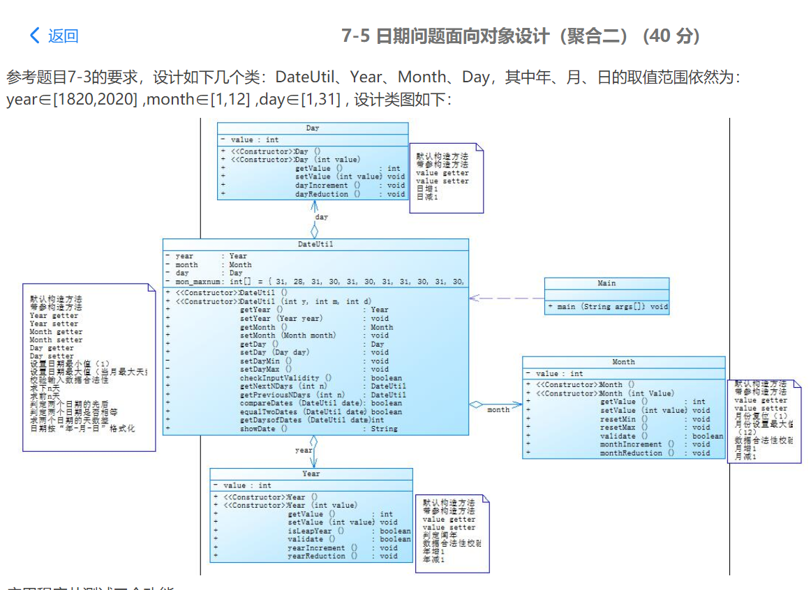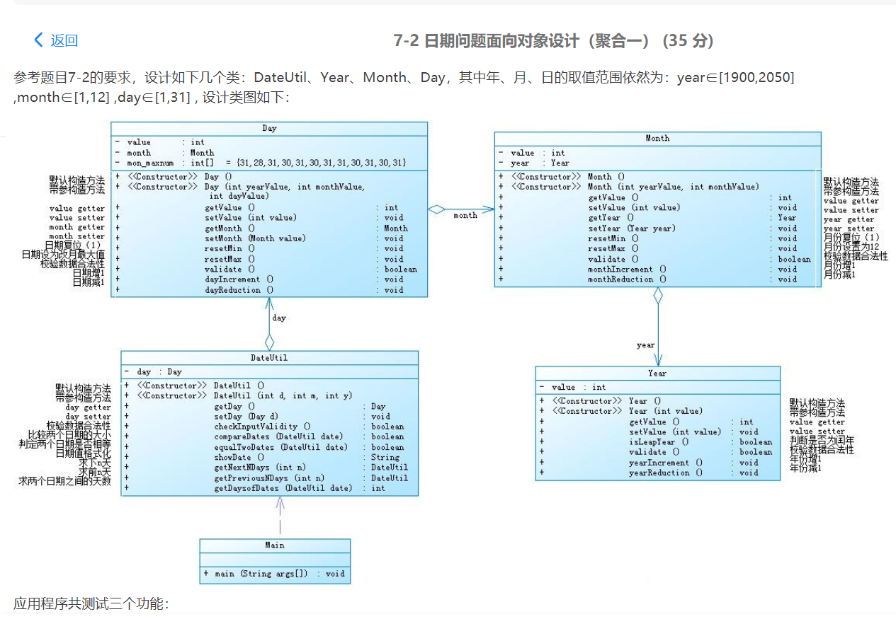 1.题目给出了类图,我们只需要将这几个类去实现,并且完成主函数部分的输入,调用,输出即可,题目要求我们利用类的聚合,关于聚合,我理解就是has关系,比如说,学生是个类,里面的属性有着各种信息,然后学生的地址也是个类,地址类中有着省,市,区,街道等一系列的属性。每个学生都有一个地址,所以这里的地址类跟学生类就是一个聚合关系,has的关系,这道题目相当于一个DateUtil有着day,有着month,有着year,然后他们小类中有有着各自的属性,有了这个大体的思路,我们就要进行详细设计了。
