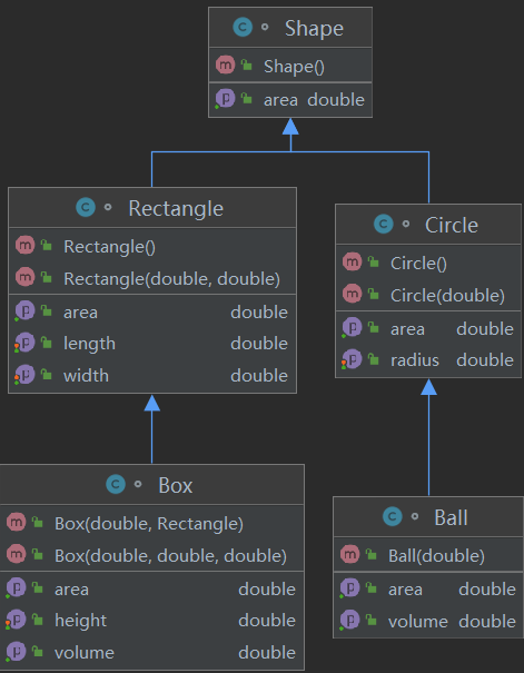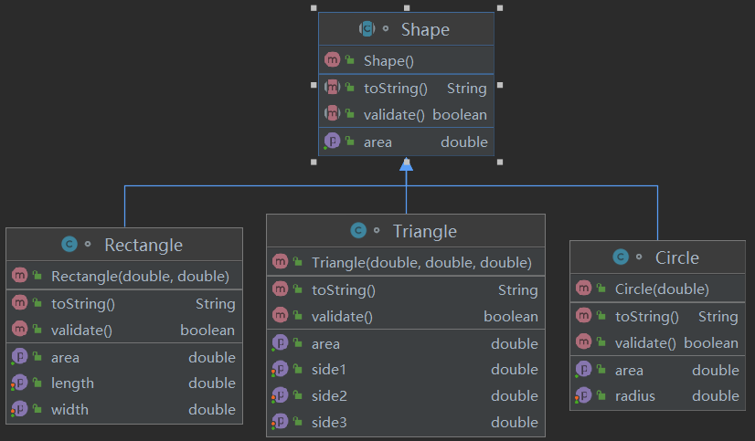 以此看出其类间关系既是继承,三个形状类都要继承父类的两个方法,只不过在调用时需要去根据需要和要求去进行方法重写。