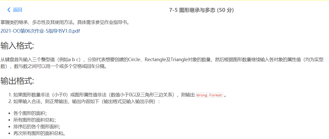 在这道题中我们是利用抽象类来定义子类,在Java语言中,用abstract 关键字来修饰一个类时,这个类叫作抽象类。抽象类是它的所有子类的公共属性的集合,图形多态与继承题目中一直设计到父类中定义的方法在子类中实现或者得到重写,然后再主方法中调用父类创建一个子类,使它多态化。我认为多态的作用可以使得代码更加简洁,在父类中给出方法的签名或者大体细节,然后子类中对父类的方法进行重写。在实际调试中,我们主要还是注重类的设计,理解清多态的意义以及继承关系。
