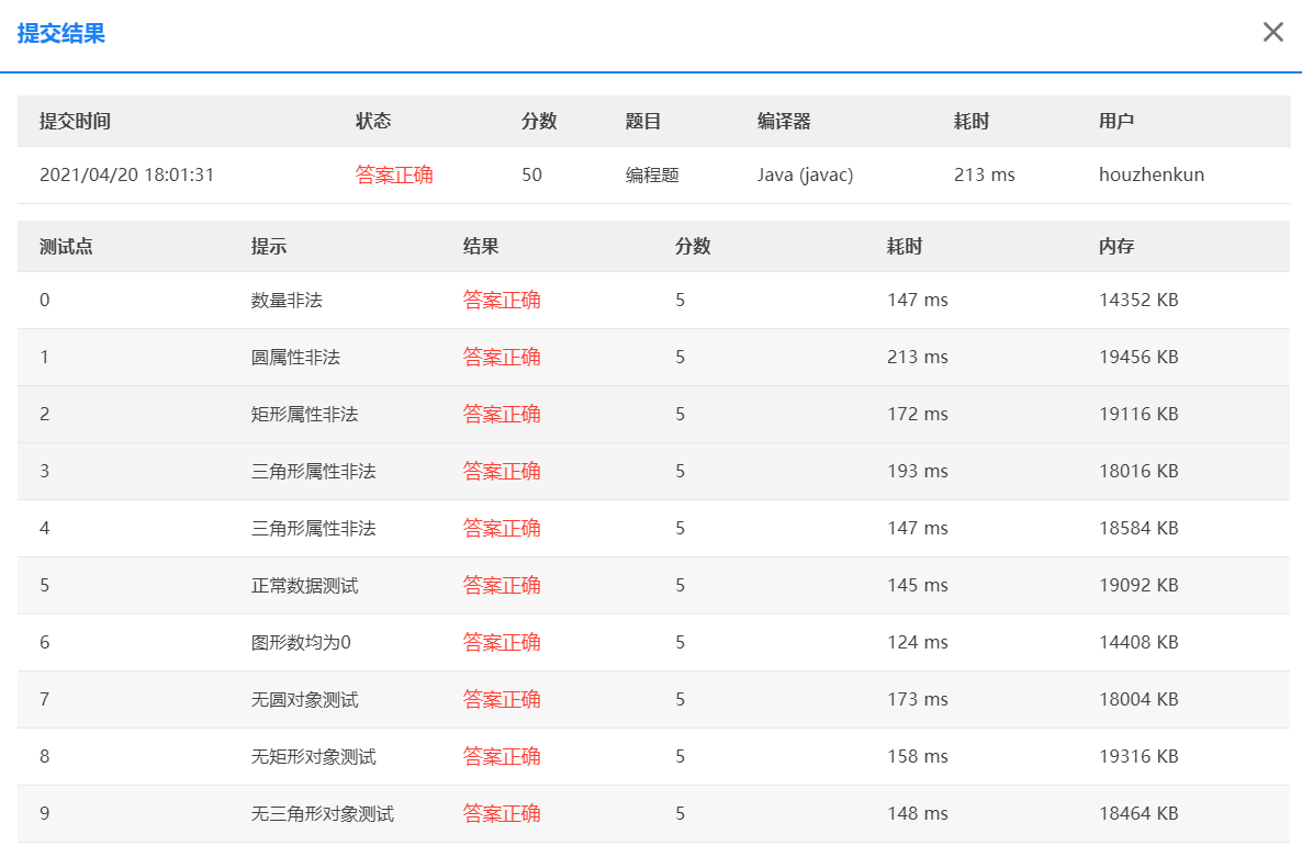 由于这道题核心代码只是考察我们接口的定义及使用,其他的地方并没有太大的难度只是一道基础题,所以也是很简单的就通过了而且最大圈复杂度也不是很高。很简单即可通过