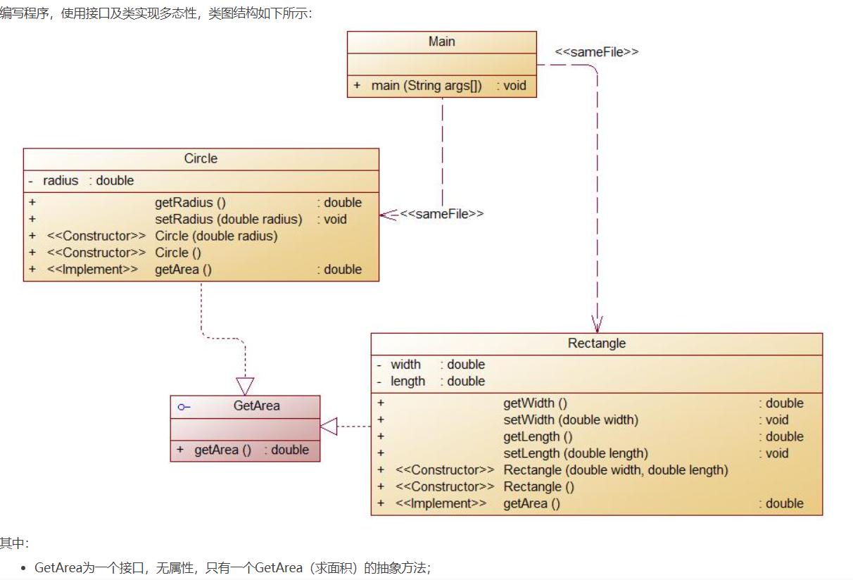 这道题要求使用接口,我认为接口是一个保存了方法签名的一个集合。每一个类在使用接口的时候,可以对接口给出的方法进行重写根据题目类图设计可以得到接口