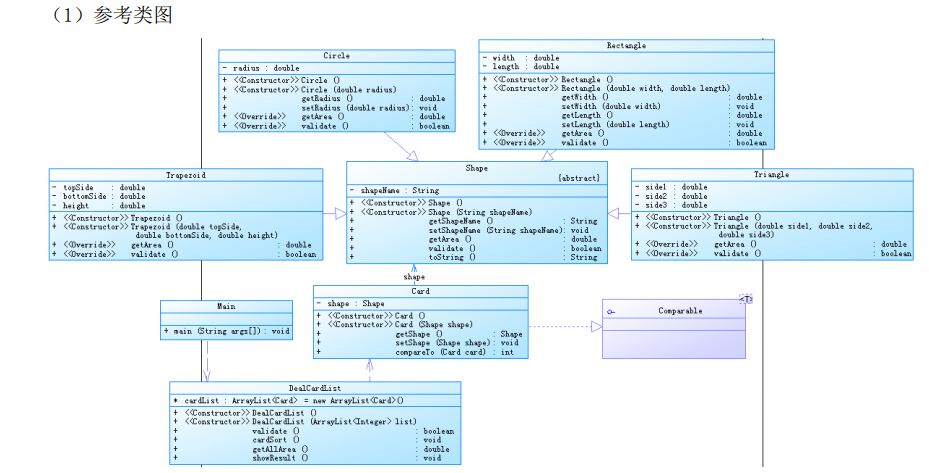 2.题目给出类图,主要的就是一个Comparable 接口的应用,并且利用其接口实现对卡片进行排序。