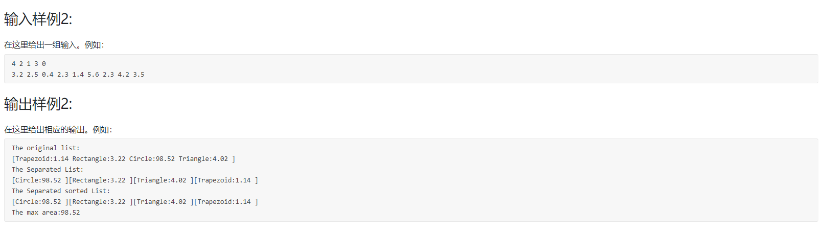 1.这道题是输入一串数据,通过判断输入数据对应的形状来按顺序输出其形状及其面积。看似很简单,但是题目没有给输入多少个数据,只是说了输入0之后停止,所以在这里我们就不能去利用数组储存这些数据,而是用动态数组去进行数据的储存。