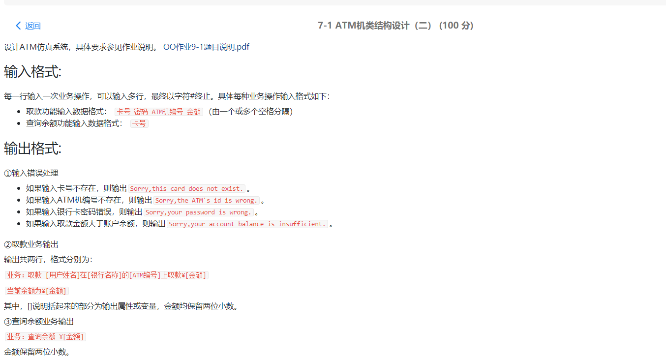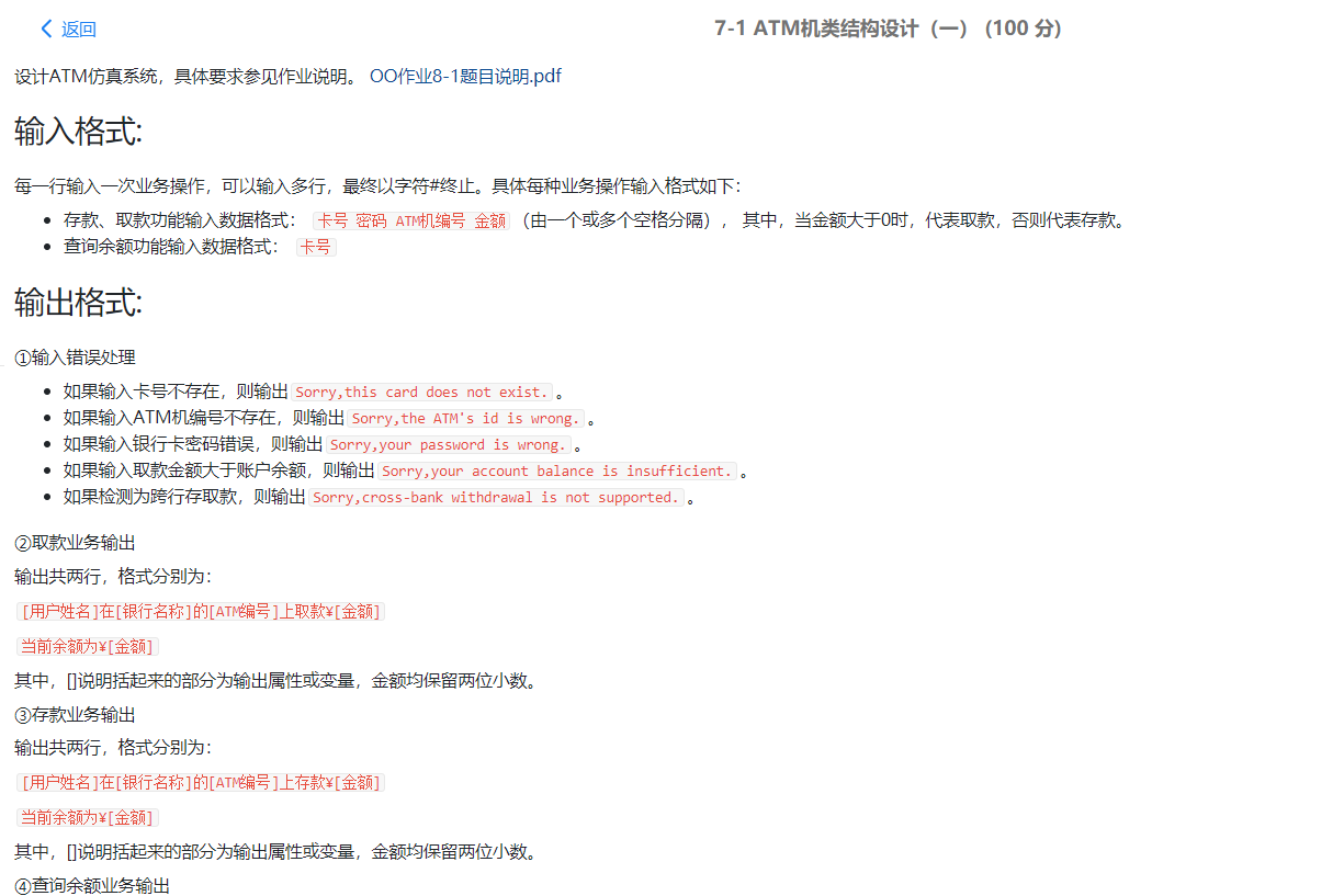 这两次题目集一次就一道题,第八次是首次类似大作业,对ATM机进行类设计,这次作业是在上课讲了面向对象程序设计原则之后开始进行的,所以本次老师要求的比较严格,作业说明也给的很详细,大概就是多个类之间的关系,但是在得出答案的同时还要保证面向对象的设计原则,所写出的程序不能单单面向答案编程。