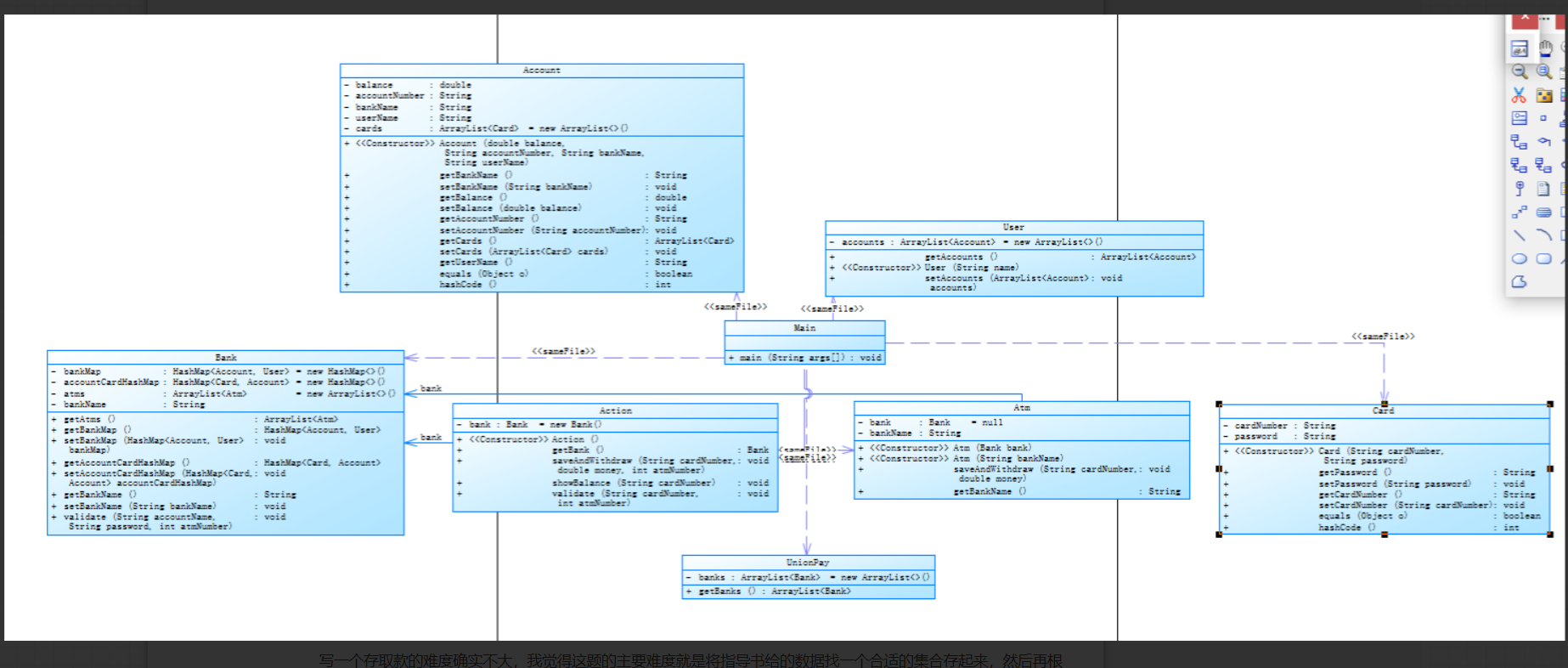 题目详细说明中有银联,银行,用户,账户,卡号等一对多的各种关系,所以相当于某个类可能就为某个大类的一个属性,因此我们通过给出的信息来确定关系:银联等作为各个独立的属性,一个银联包括多个银行,账户属于银行的账户,每个人可以再某个有多个账户,每个账户也可以有多张卡,但是由于我们要求的不仅将题目要求中给定的人去存进去,程序得有可拓展性,应用于实际生活,银行可以将很多很多的账户信息存入银行中,所以这里不能用数组进行储存,还是要用ArrayList进行数据储存,并且这次的ArrayList储存的不是数,也不是字符串,而是一个个的属性类。本次作业我的得分为70分,实际上这70分应为0分,没按要求写,接下来关于后两次关于Atm机的博客,我将换一种写法,深刻剖析一下最后的总结性类设计用我自己写的错误示范与老师发的示范源码进行比较总结。
