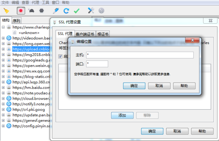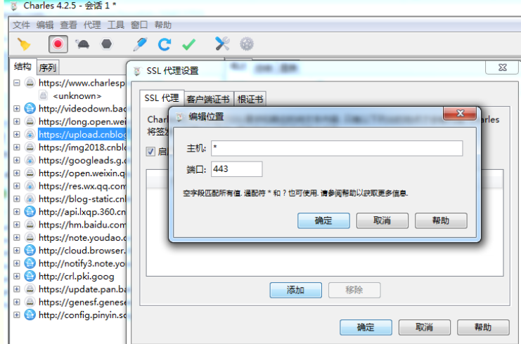 代理-SSL代理-启用SSL代理-添加 如图主机和端口都添加*。