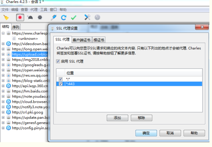 继续:代理-SSL代理-启用SSL代理-添加 如图主机添加*,端口添加443.