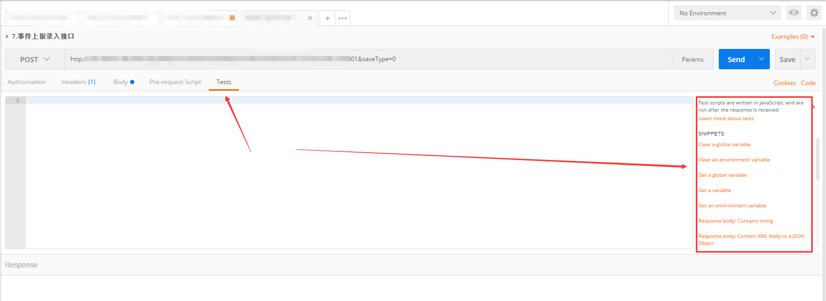 postman可以在请求模块的Tests标签添加断言,比较方便的是,postman已经提供了一些代码片段供我们使用