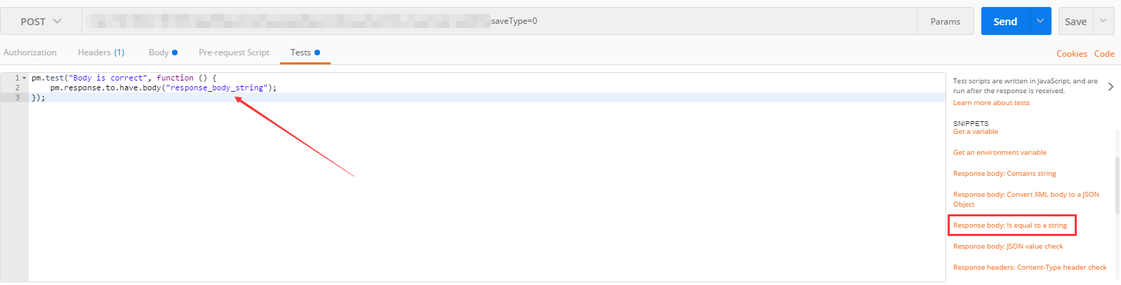 点击选择【Response body:Is equal to a string】,左侧出现如下代码段