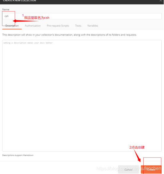 2.给新建的Collection测试集命名(这里我命明为csh)---点击create进行创建;