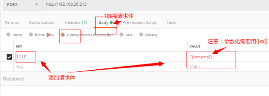 注意:这里由于我要进行参数化请求,因此body中的value值需要进行参数化:参数化格式:{{name}}--然后保存